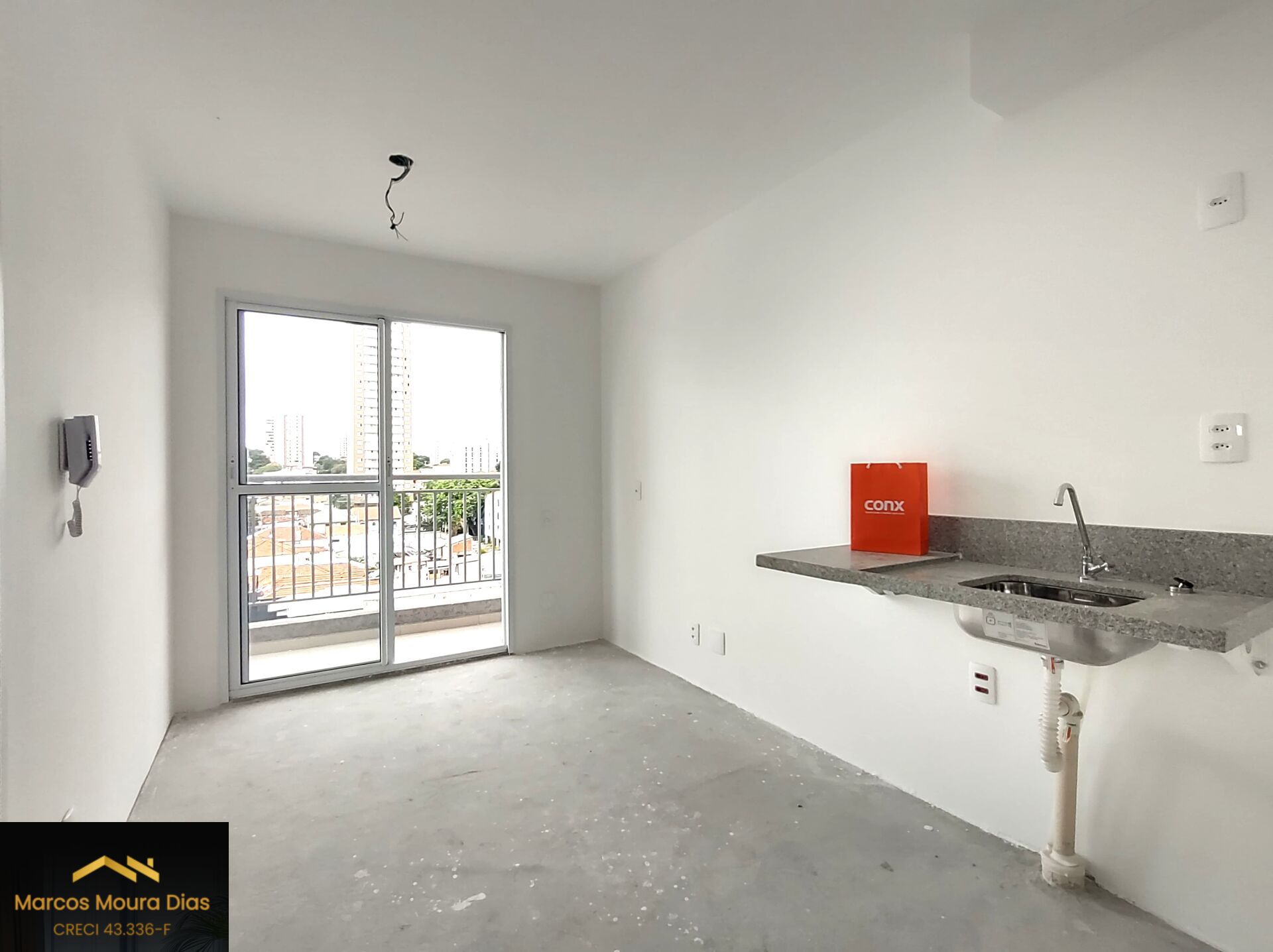 Apartamento Studio Novo de 1 dormitório com piso laminado, com varanda e vista livre, garantindo excelente luminosidade e ventilação.