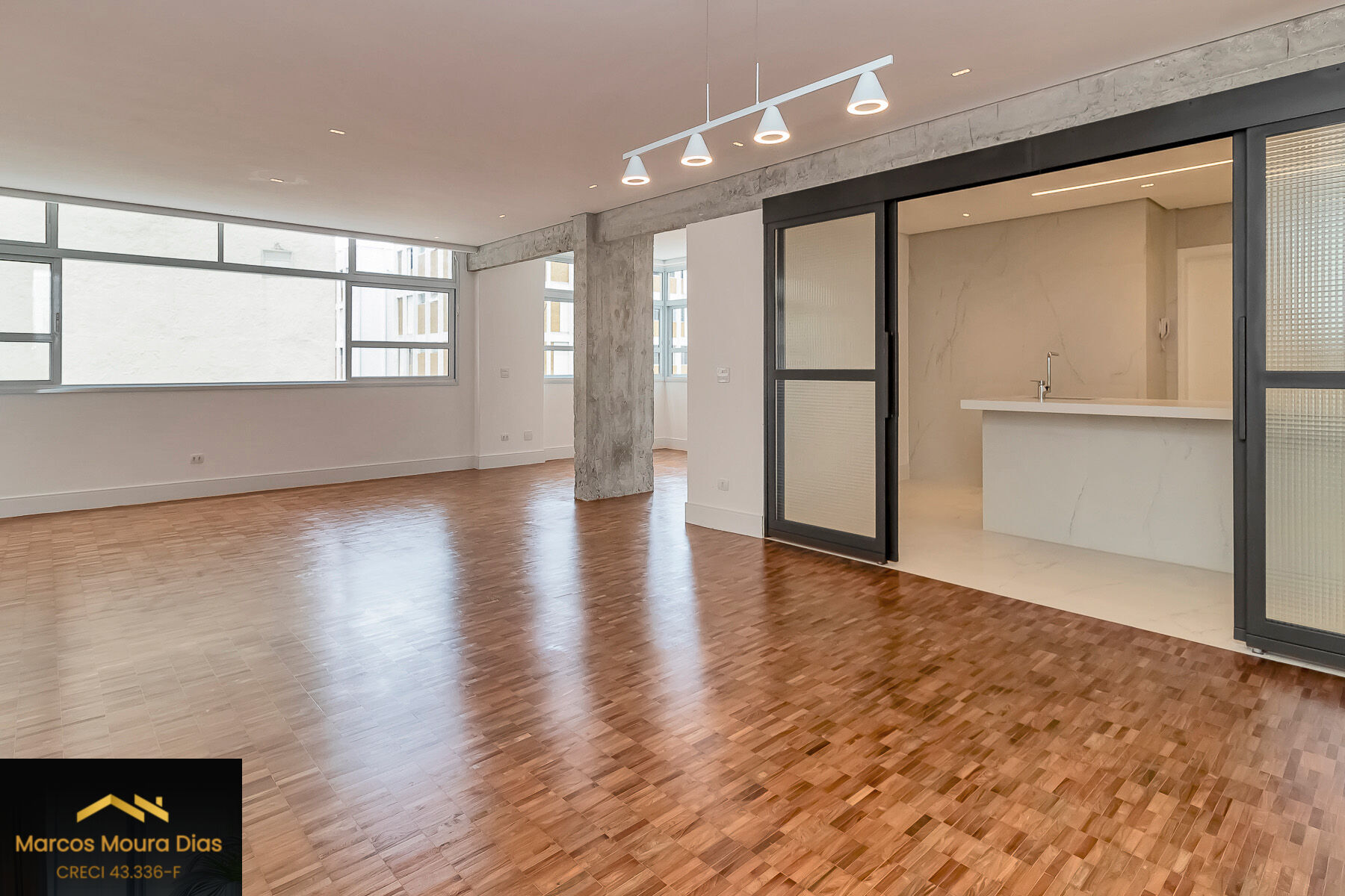 A planta quadrada desse apê possibilitou que o Arquiteto mexesse na circulação da área íntima para criar 3 boas suítes, uma delas master. Os quartos são todos de frente para o Al Tietê e muito ensolarados. Na área social já existia a tradicional integração da cozinha com a sala de jantar, aumentando assim o espaço de convivência. Uma porta de serralheria de ferro com vidro poderá promover a separação ocasional desses ambientes, mantendo o estilo contemporâneo da reforma. A ampla sala (quase 60m2) conta ainda com um ambiente destacado, coringa para ser um escritório, sala de TV ou sala de leitura.