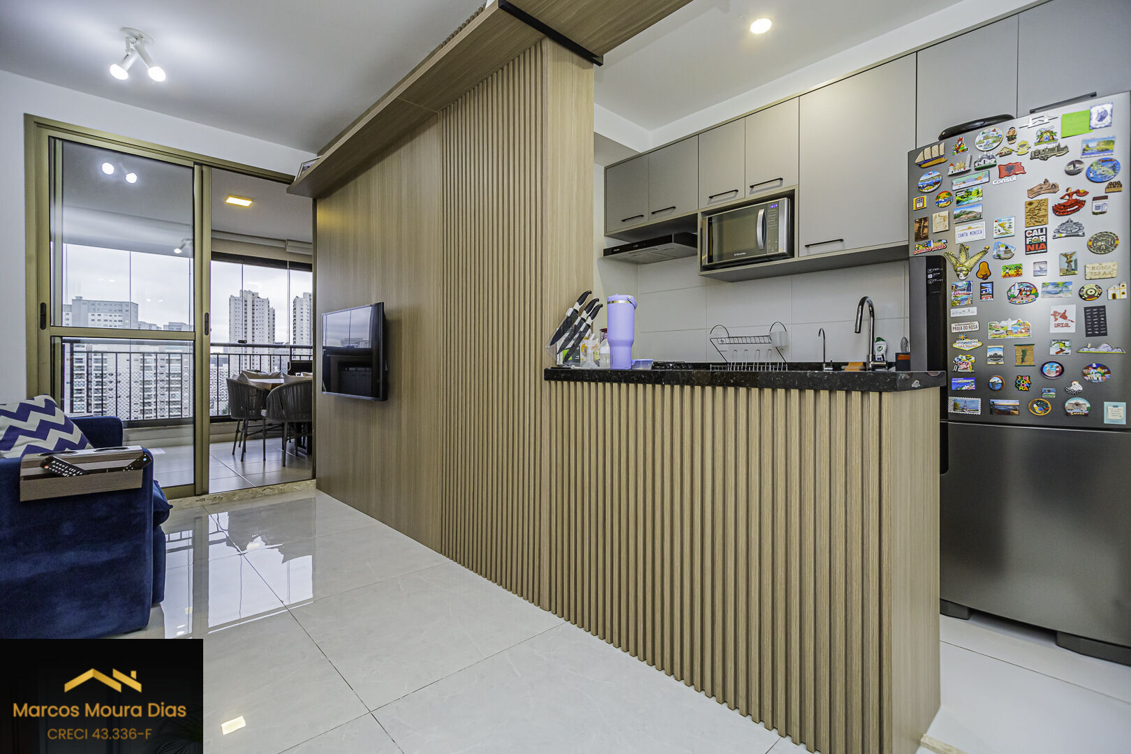 Com 2 dormitórios, sendo uma suíte espaçosa, um quarto , sala ampla com dois ambientes com painel ripado para suporte de TV e bancada de mármore, integrando a cozinha americana com móveis planejados com forno e fogão embutido integração à varanda gourmet com churrasqueira, área de serviço , banheiro social e uma vaga de garagem.