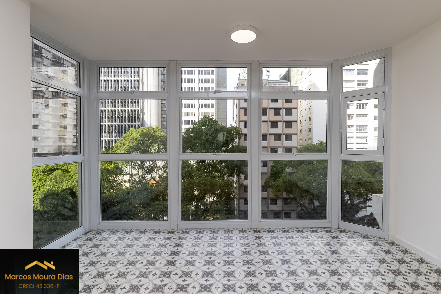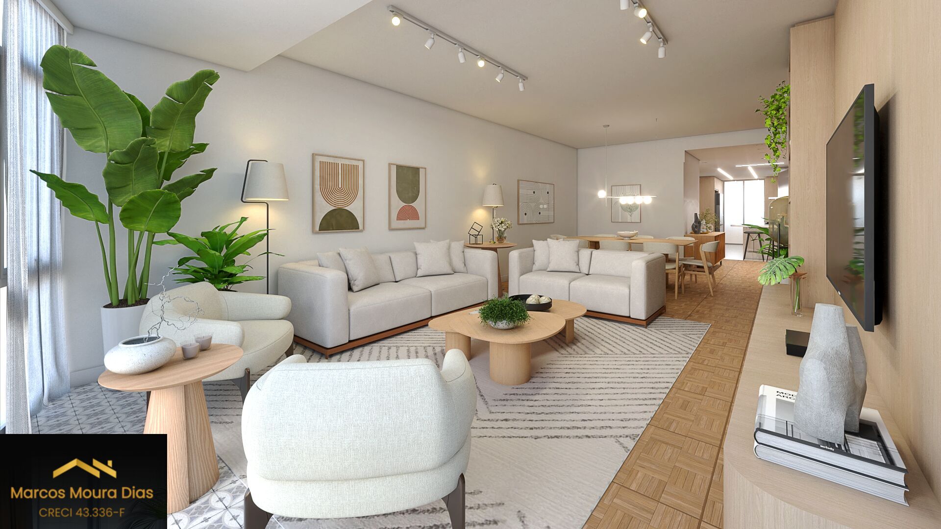 Esse apto de 141 m² tem aquela combinação rara que inclui muita luz natural, vista incrível, e um projeto muito bem resolvido. A sala ampla, com seu janelão do chão ao teto, deixa a clareza preencher cada canto e realça o charme do piso em mini parquet, que aquece o ambiente. O pilar em concreto aparente traz textura ao espaço social.